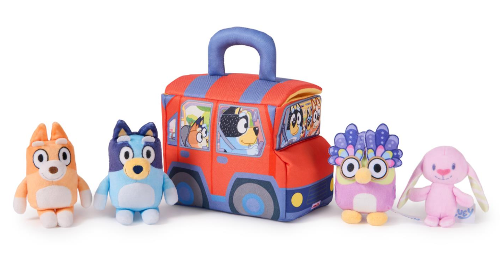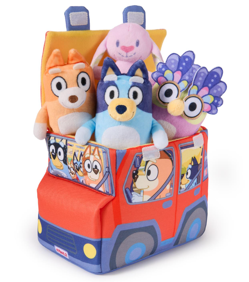 - BLUEY PLUSH PLAYSET: Bluey and Bingo are here to play! This soft plush playset features Bluey`s family car, which neatly stores 4 soft sensory toys: mini Bluey and Bingo plushies, a Chattermax squeaker toy, and a Floppy bunny crinkle sensory plush.