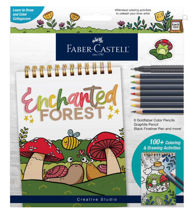 Featuring Goldfaber Color Pencils in six vibrant colors, the break-resistant leads are highly pigmented, water-resistant and smudge-proof. Color your way through pages and pages of adorable, enchanted forest illustrations. Colorfully create your own scenes, as you learn the basics of how to illustrate enchanted forest characters on the “Let’s Doodle” Drawing Activities pages.