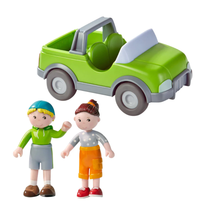 The Little Friends car with trailer hitch perfectly complements the play world of HABA's flexible dolls and looks great in front of the doll's house. The lifelike mini dolls encourage creative play adventures.