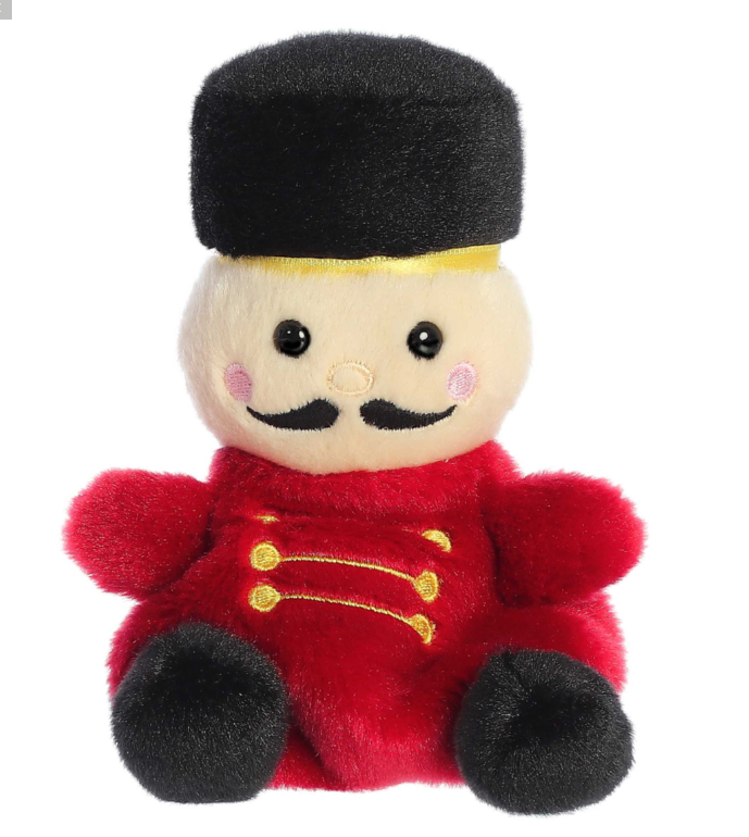 Marius Nutcracker sports a vibrant red uniform accented with golden buttons, exuding a classic holiday charm. His black mustache and round cheeks are ever-present beneath a tall, black fur hat, making him a distinguished figure in any festive setting.