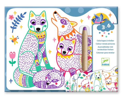 Forest Families Color Reveal Set by Djeco is a pocket-sized colouring activity for young children that includes 12 shaped colouring cards and a jumbo coloured pencil. The pencil reveals colour only in predetermined areas to uncover hidden patterns and surprises, making colouring feel magical. The set comes in a practical portable storage pocket and is made with FSC certified paper, designed for little hands and recommended for ages 3+.