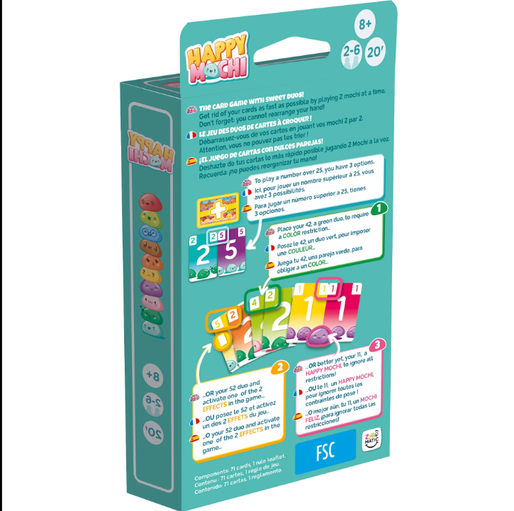 - SPECIAL EFFECTS & COLOR RESTRICTIONS: Use the unique card effects and color restrictions to challenge opponents, or play the powerful Happy Mochi card to bypass all rules!