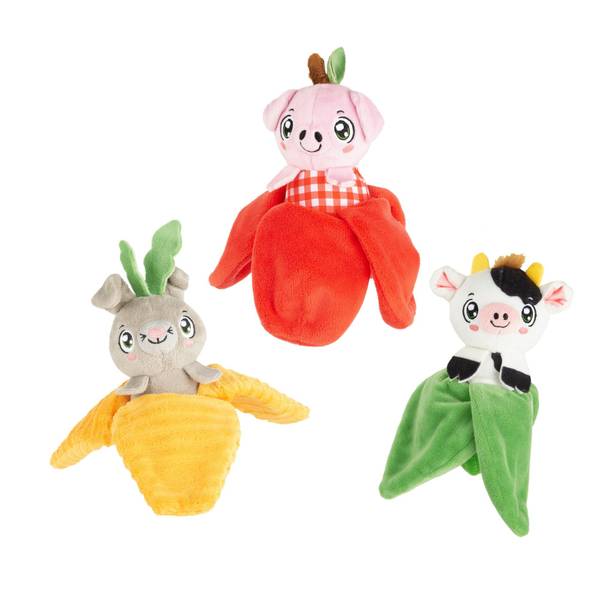 - 3 Animals: Assortment includes a cow inside a corn husk, pig in an apple, and bunny in a carrot